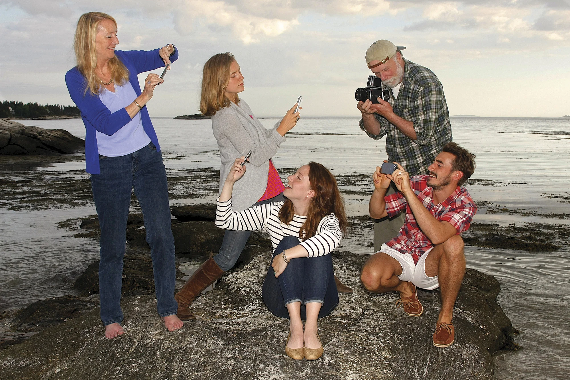 Everybody but old dad has one of those cell phones that do everything—I believe they are called “smart phones”—I’m not sure why. Anyway, unbeknownst to me a plan was hatched—a smart phone convention on the rocks at Hendricks Head beach. Get the tripod dad and follow us. What a riot. We drove everybody off the beach with our laughter. Some poor motorcyclists from Ohio will never be the same. Their loss. I grabbed my Hasselblad—not an unfamiliar body part, sorry to say. One of the greatest cameras ever made, in my opinion—a real workhorse. But a total relic in today’s technological age. I don’t think I care. I love the camera and still use it.